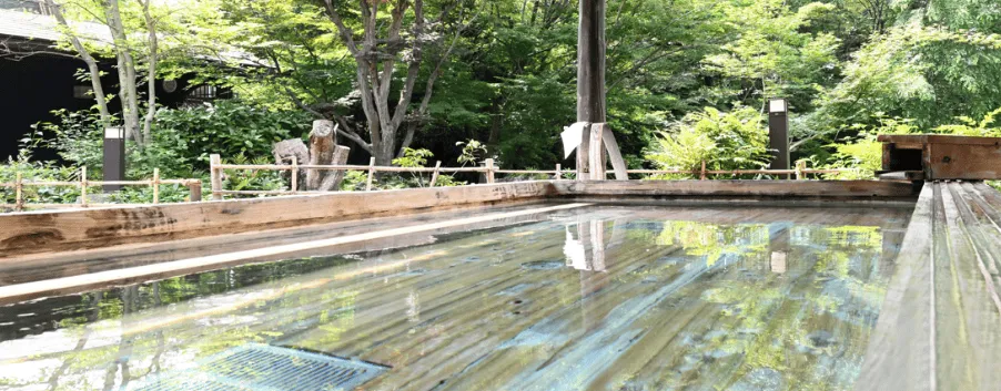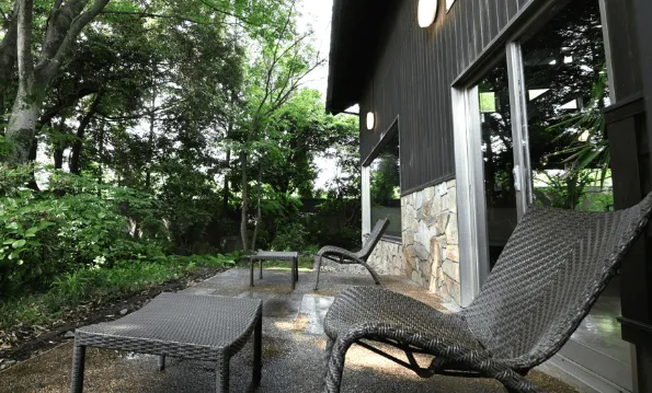 春は桜、夏は森林浴、秋は紅葉といった四季折々の彩りが楽しめる屋外露天風呂。昼には小鳥のさえずり、夜には星空を見上げたりと、心ゆくまで自然との憩いを満喫してください。